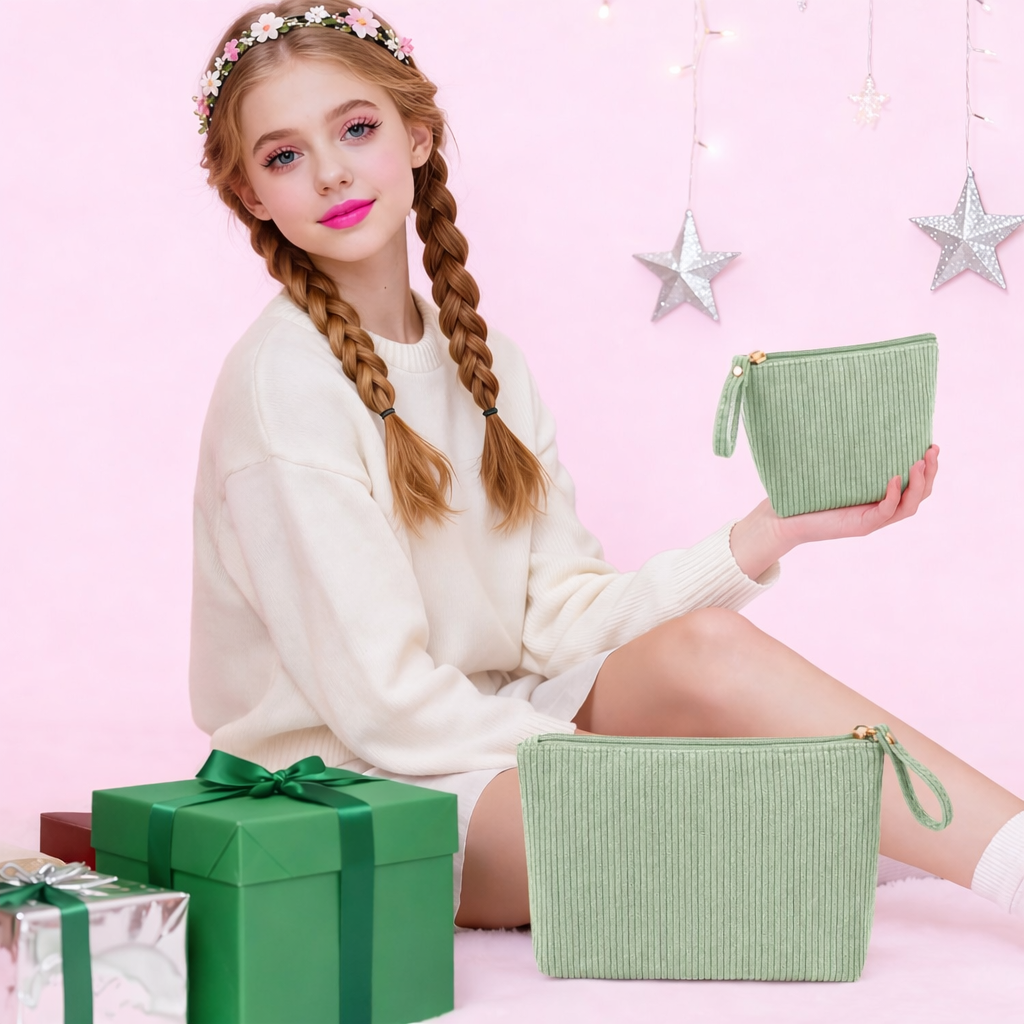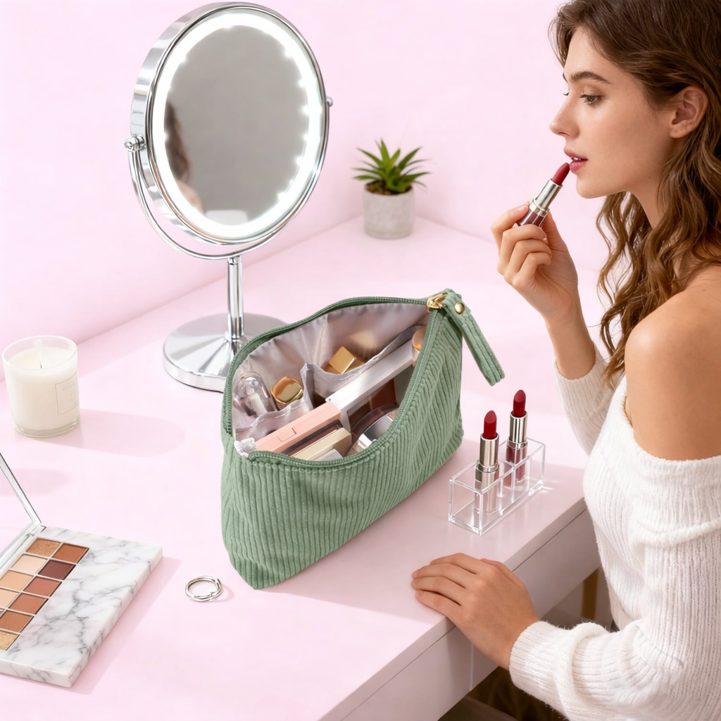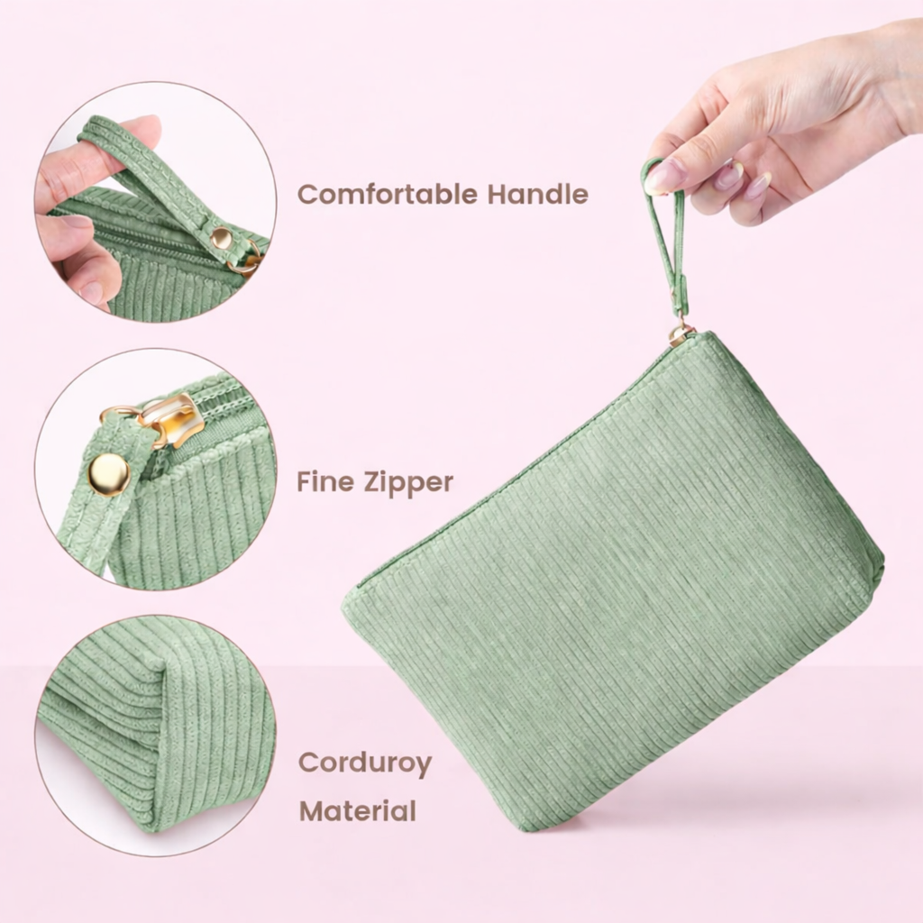 This compact corduroy makeup bag is designed to keep your daily essentials neatly organized. With a soft fabric feel and secure zipper closure, it fits easily into your purse while keeping makeup and small items in place.