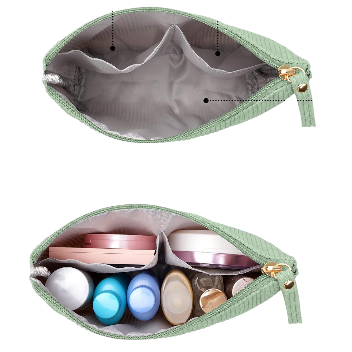 This small makeup bag is designed for organizing daily essentials inside a purse, backpack, or travel bag. It features a soft corduroy exterior with a structured shape that helps keep items neatly contained while on the go. The interior includes divided pockets that separate small accessories such as lipsticks, cards, keys, and cables, allowing quick access without clutter.